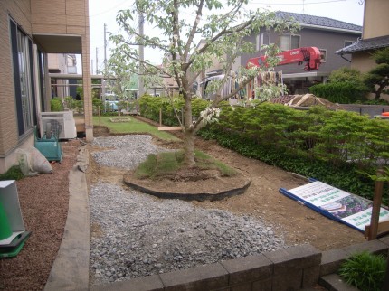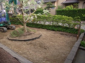 芝生を剥ぎ取り、砕石で下地を作っていきます。