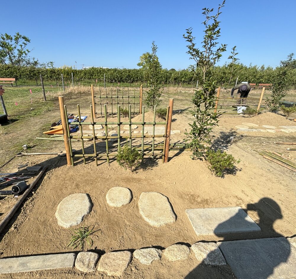胴縁が4本・前面の立子が2本の四目垣で、技能検定で作ったものと比べるとかなり堅牢な雰囲気の仕上がりました。