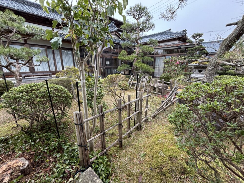 修繕後の綺麗になったお庭に、金閣寺垣から四目垣にリニューアル。