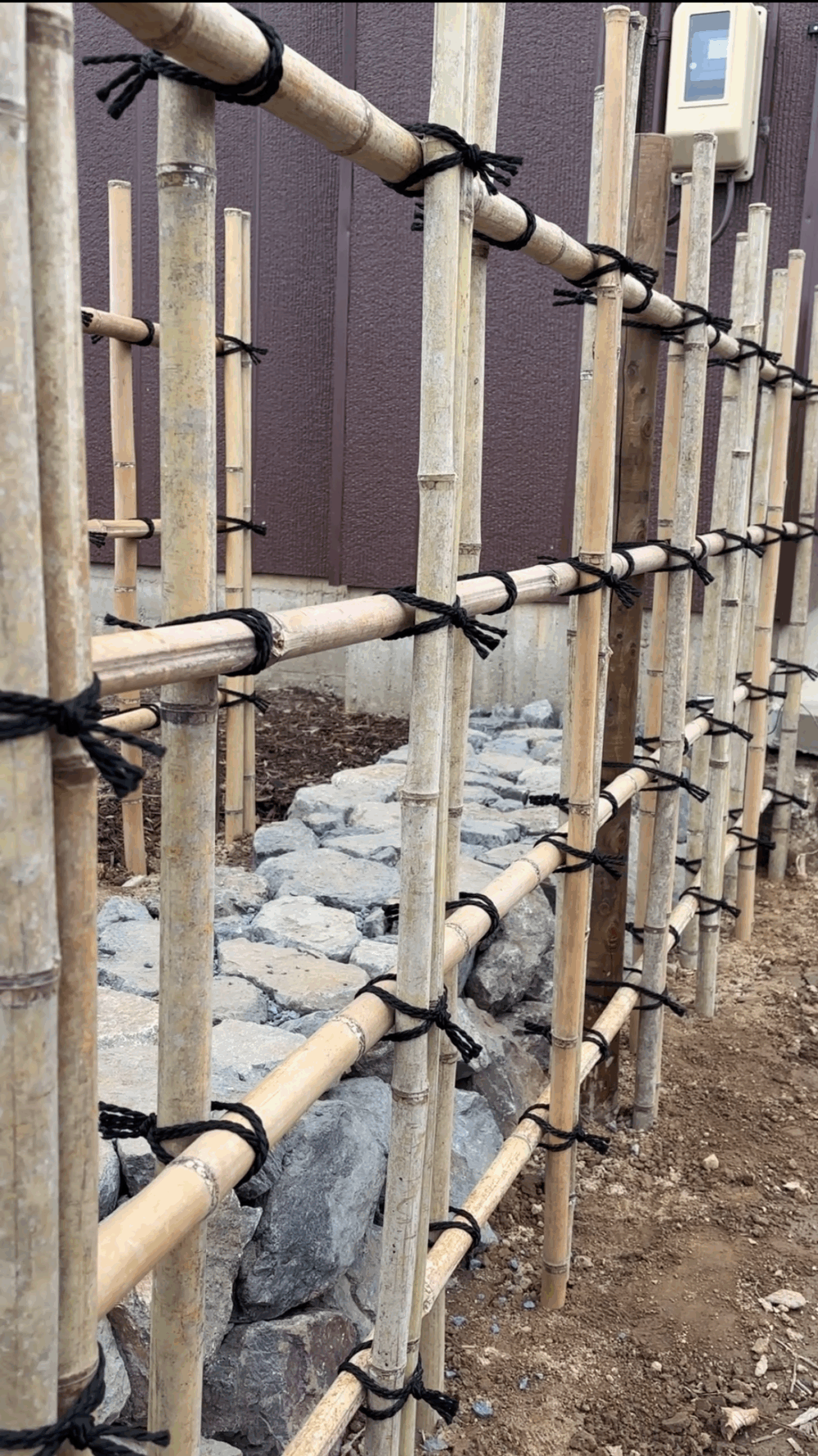 さて、直近のお庭作りでは天然竹を使って四目垣を造りました。