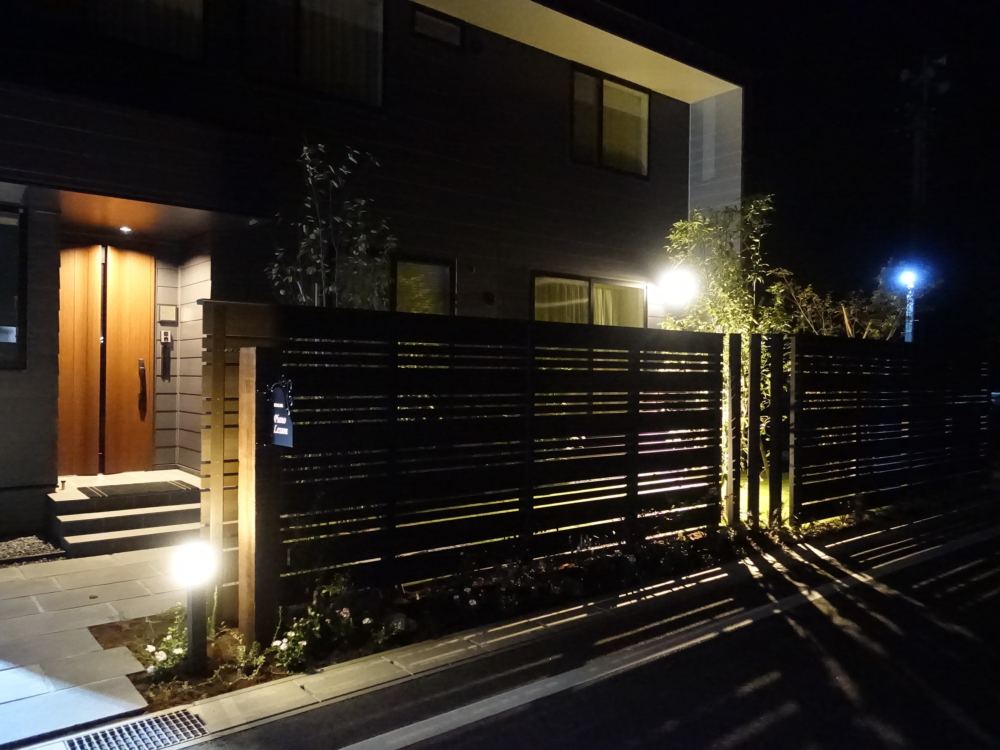 夜のライティング。 フェンスと木調柱の影がつくるラインが印象的。 玄関前を明るくすることで安心感を持たせることが出来ます。