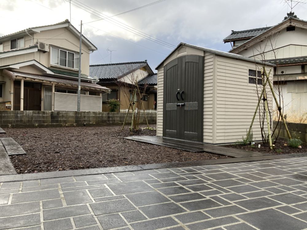 大容量のアメリカンな物置アクティブシェッドと枕木のアプローチ。アウトドアが楽しめる大人カッコイイ遊び場スペースの趣。 物置にはタイヤやガーデニングの道具が楽々収納できます。ガーデニングスペースには防草効果、保水保温効果のあるウッドチップが敷きならしてあります。 物置周りはジューンベリーやハーブなど、実や香りが楽しめる植栽です。